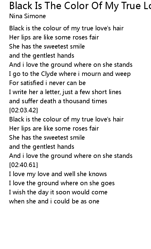 The lyrics for black is the color of my true loves hair by nina simone have been translated into 5 languages. It is about a girl who is waiting for her lover to return from sea. Amgfso black is the color of my true love's hair. Look ahead, and i would see someone always loving me. Emamof my true love's hair.